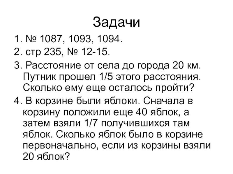 Задачи1. № 1087, 1093, 1094.2. стр 235, № 12-15.3. Расстояние от села до города 20 км. Путник