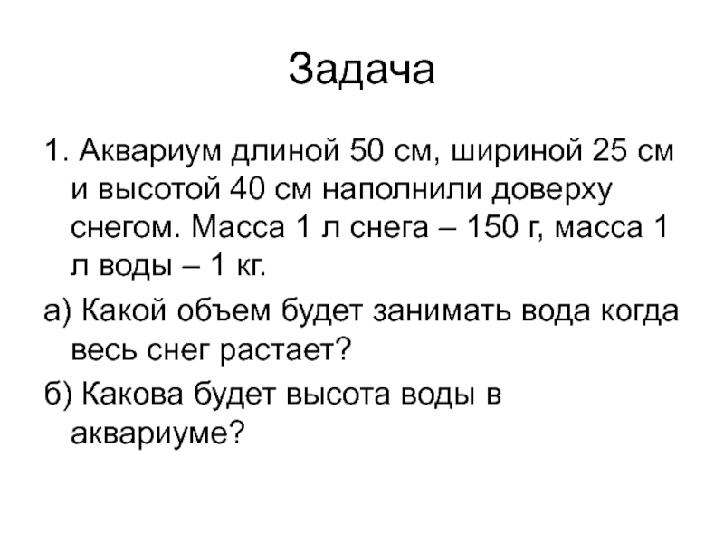 Задача1. Аквариум длиной 50 см, шириной 25 см и высотой 40 см наполнили доверху снегом. Масса 1