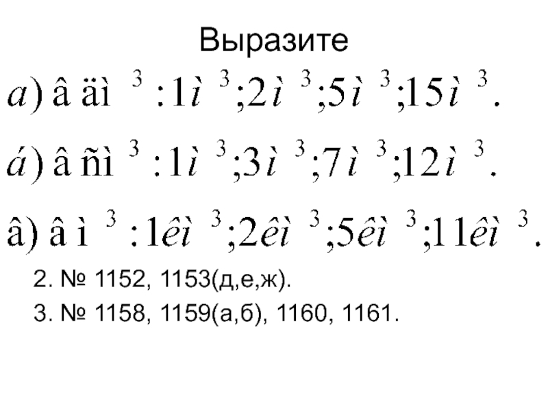Выразите2. № 1152, 1153(д,е,ж).3. № 1158, 1159(а,б), 1160, 1161.