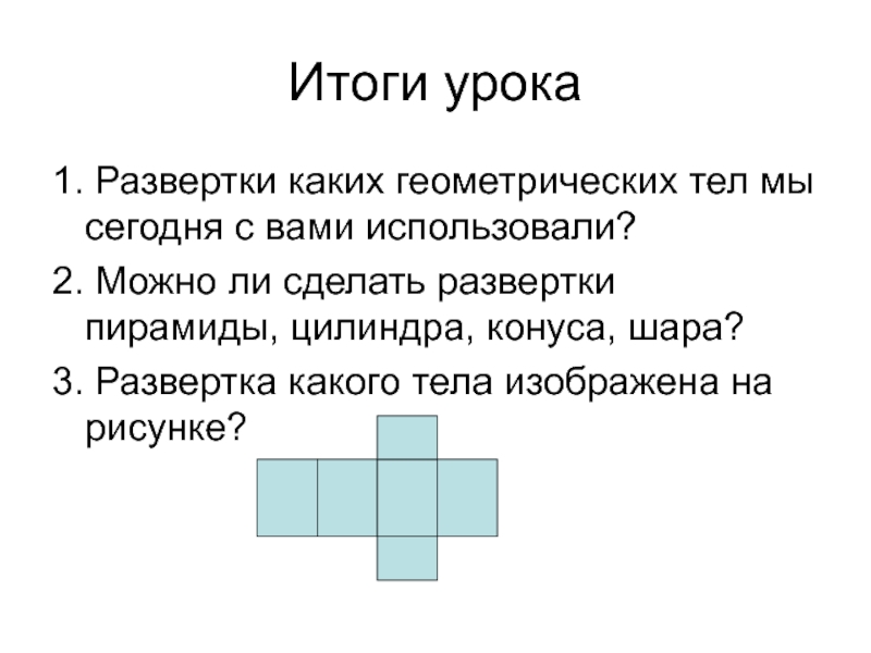 Итоги урока1. Развертки каких геометрических тел мы сегодня с вами использовали?2. Можно ли сделать развертки пирамиды, цилиндра,