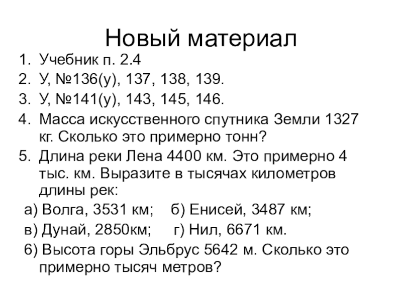 Новый материалУчебник п. 2.4У, №136(у), 137, 138, 139.У, №141(у), 143, 145, 146.Масса искусственного спутника Земли 1327 кг.