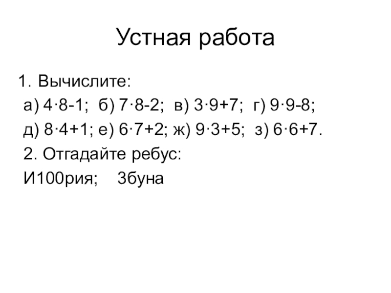 Устная работаВычислите:а) 4·8-1; б) 7·8-2; в) 3·9+7; г) 9·9-8;д) 8·4+1; е) 6·7+2; ж) 9·3+5; з) 6·6+7.2. Отгадайте ребус:И100рия; 3буна