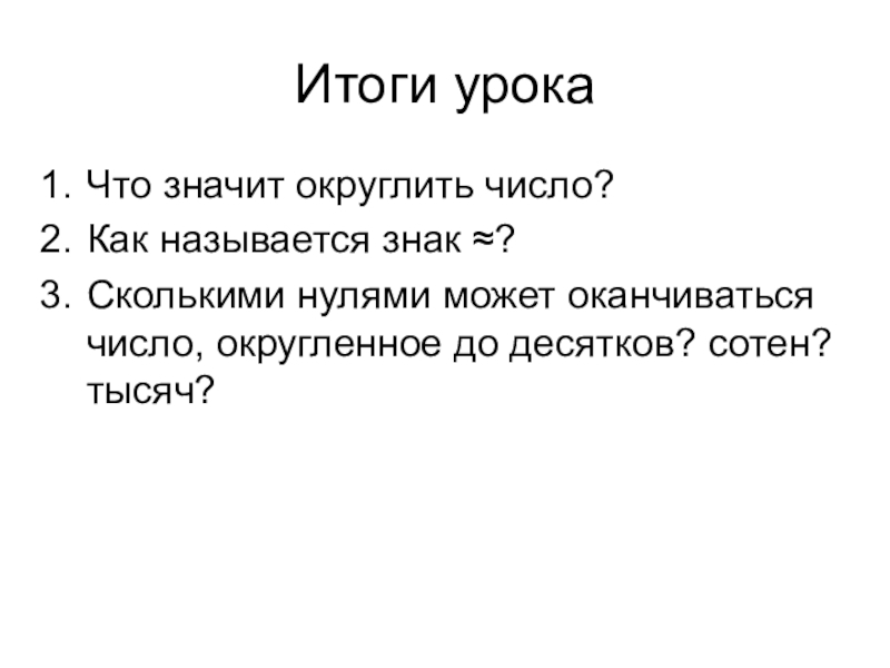 Итоги урокаЧто значит округлить число?Как называется знак ≈?Сколькими нулями может оканчиваться число, округленное до десятков? сотен? тысяч?