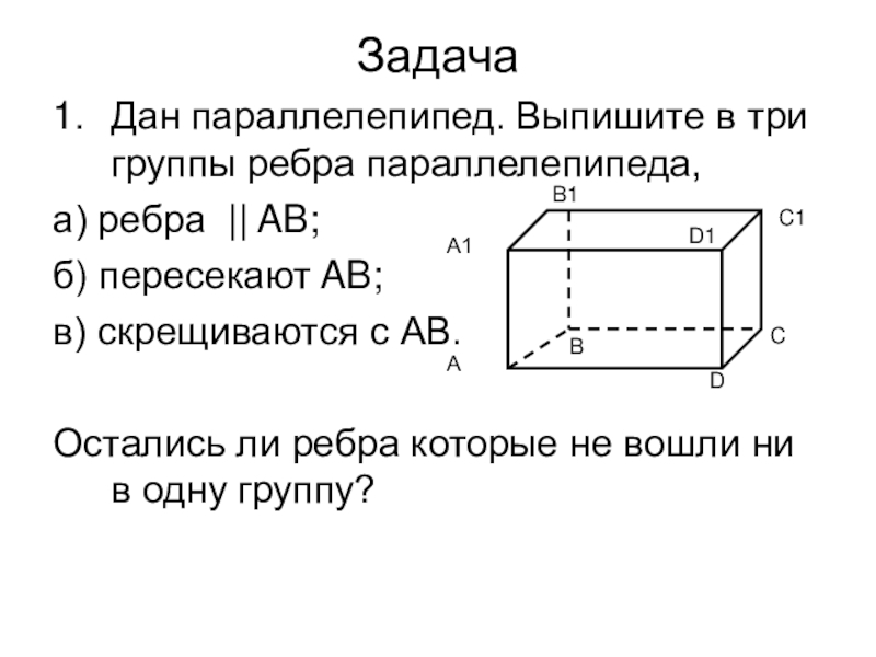 ЗадачаДан параллелепипед. Выпишите в три группы ребра параллелепипеда, а) ребра || AB;б) пересекают AB;в) скрещиваются с АВ.Остались