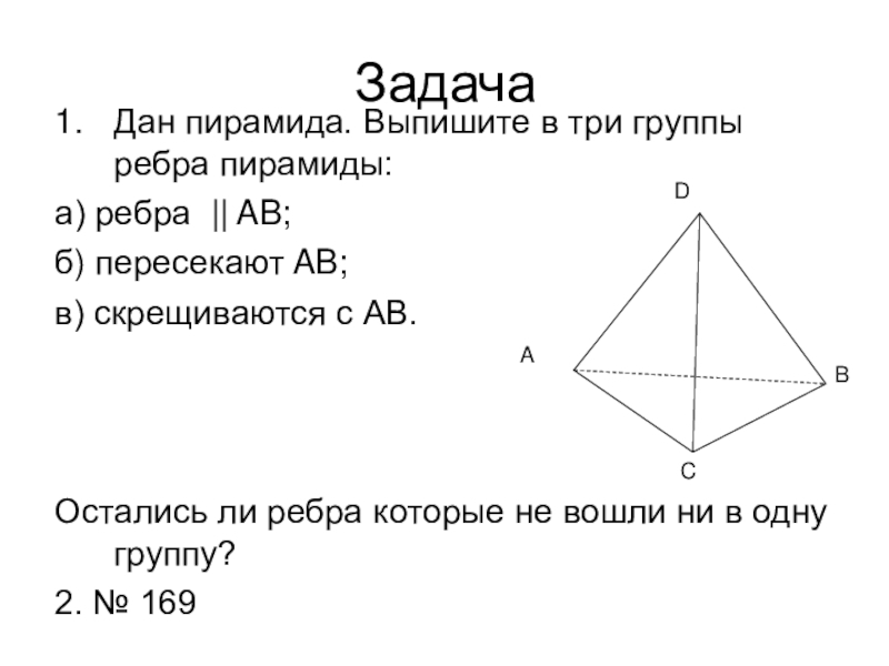 ЗадачаДан пирамида. Выпишите в три группы ребра пирамиды: а) ребра || AB;б) пересекают AB;в) скрещиваются с АВ.Остались