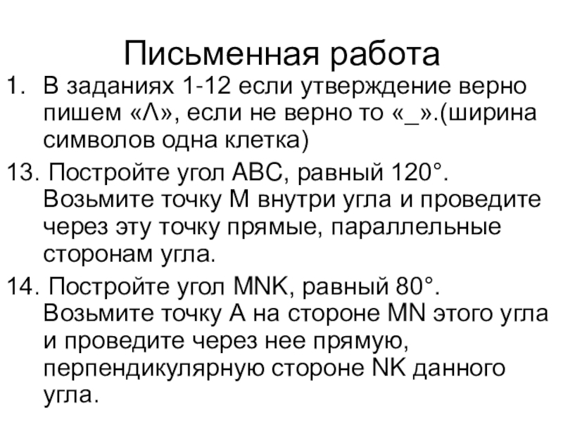 Письменная работаВ заданиях 1-12 если утверждение верно пишем «Λ», если не верно то «_».(ширина символов одна клетка)13. Постройте угол ABC, равный 120°. Возьмите точку М внутри угла и проведите через эту точку прямые, параллельные сторонам угла.14.