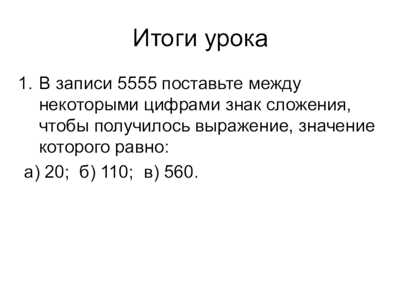 Итоги урокаВ записи 5555 поставьте между некоторыми цифрами знак сложения, чтобы получилось выражение, значение которого равно:а) 20;
