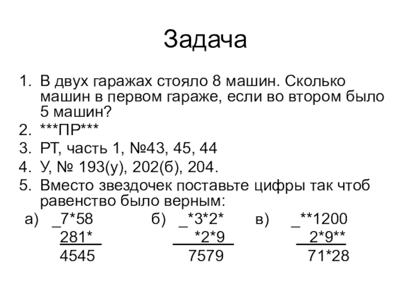 ЗадачаВ двух гаражах стояло 8 машин. Сколько машин в первом гараже, если во втором было 5 машин?***ПР***РТ,
