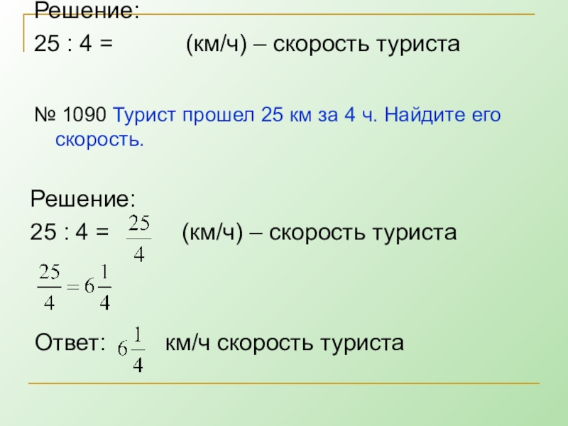 № 1090 Турист прошел 25 км за 4 ч. Найдите его скорость.