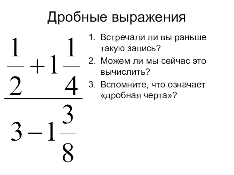 Дробные выраженияВстречали ли вы раньше такую запись?Можем ли мы сейчас это вычислить?Вспомните, что означает «дробная черта»?
