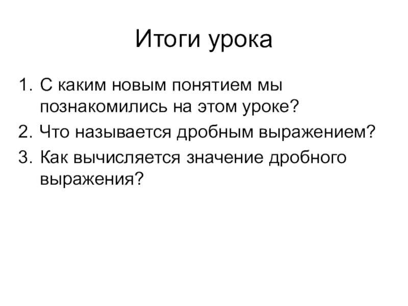 Итоги урокаС каким новым понятием мы познакомились на этом уроке?Что называется дробным выражением?Как вычисляется значение дробного выражения?