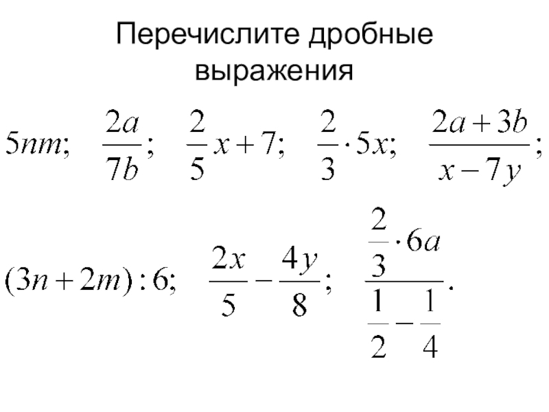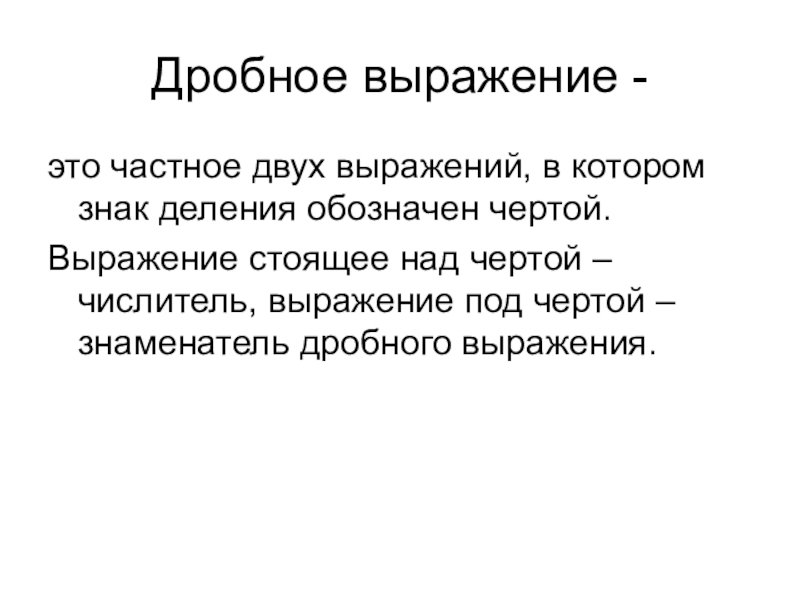 Дробное выражение - это частное двух выражений, в котором знак деления обозначен чертой.Выражение стоящее над чертой –