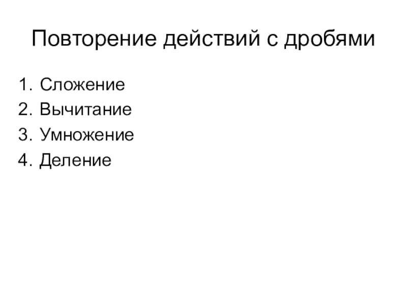 Повторение действий с дробямиСложениеВычитаниеУмножениеДеление