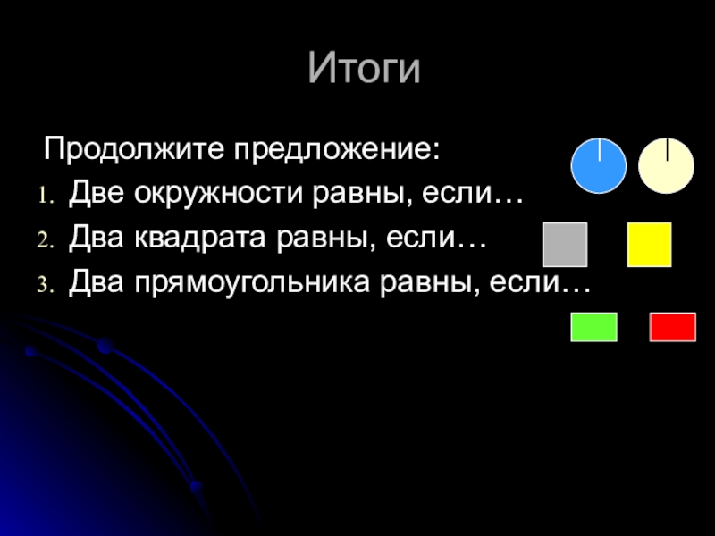 ИтогиПродолжите предложение:Две окружности равны, если…Два квадрата равны, если…Два прямоугольника равны, если…