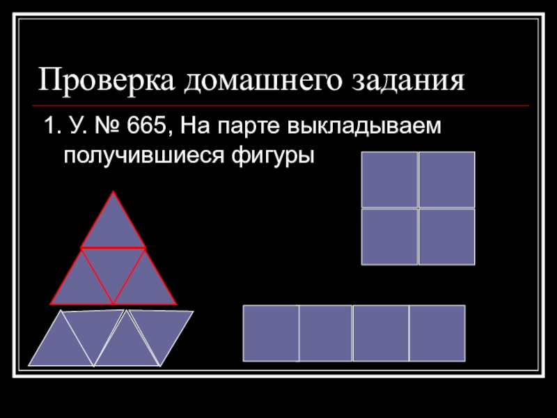 Проверка домашнего задания1. У. № 665, На парте выкладываем получившиеся фигуры