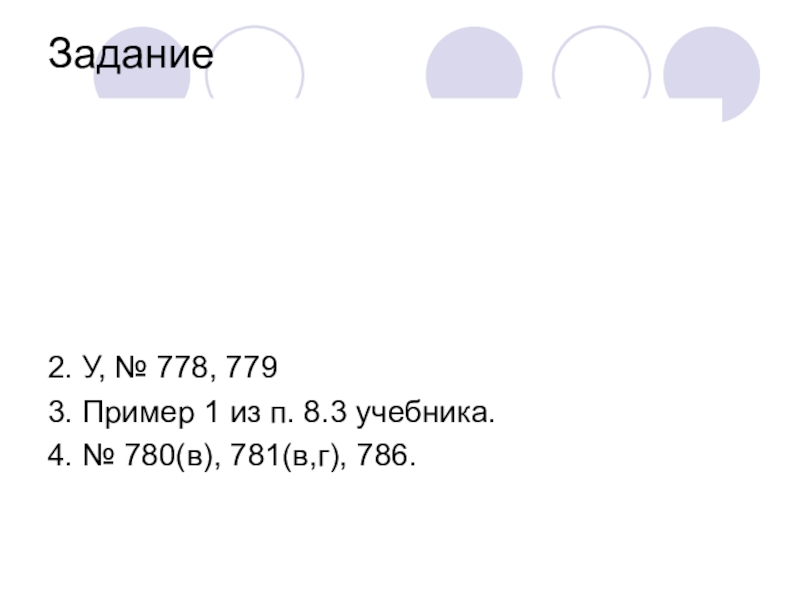 Задание2. У, № 778, 7793. Пример 1 из п. 8.3 учебника.4. № 780(в), 781(в,г), 786.