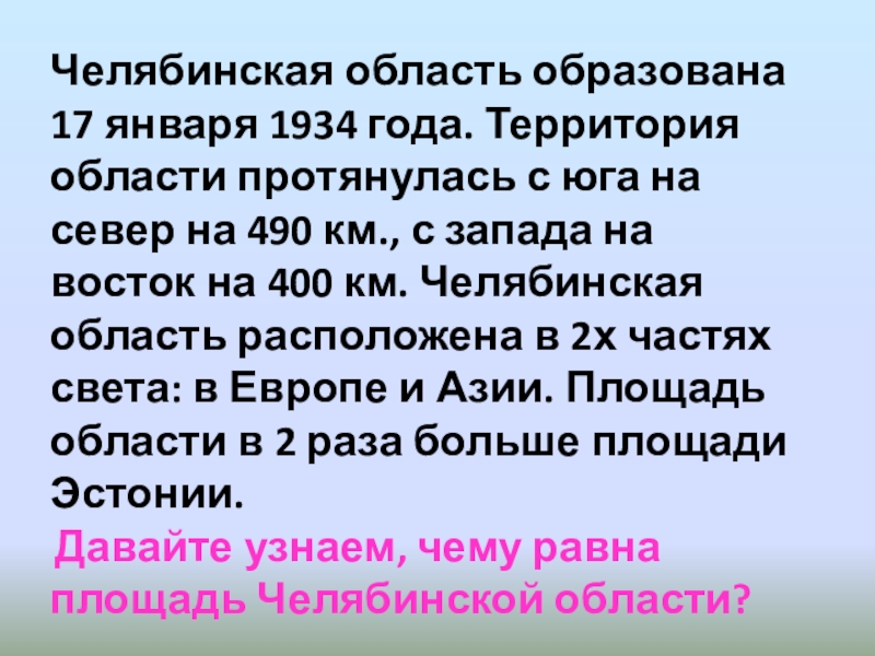 Челябинская область образована 17 января 1934 года. Территория области протянулась с юга на север на 490 км., с запада на восток на 400 км. Челябинская область расположена в 2х частях света: в Европе и Азии. Площадь