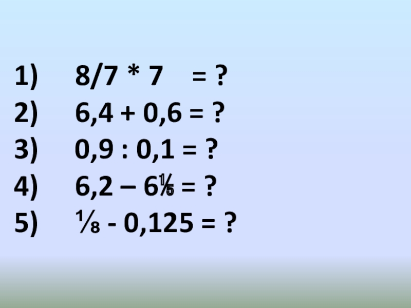 8/7 * 7  = ?    6,4 + 0,6 = ? 0,9 : 0,1