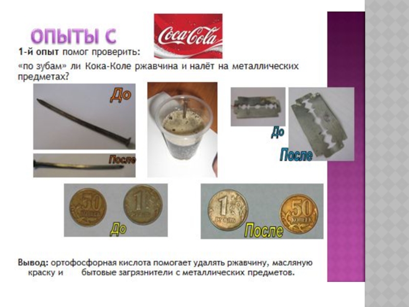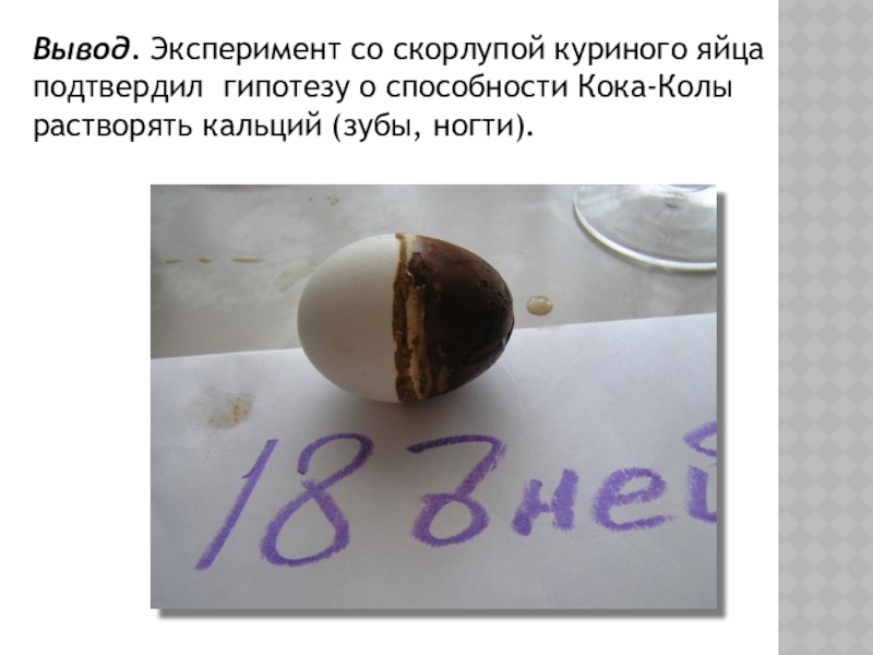 Вывод. Эксперимент со скорлупой куриного яйца подтвердил гипотезу о способности Кока-Колы растворять кальций (зубы, ногти).