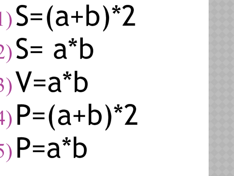 S=(a+b)*2S= a*bV=a*bP=(a+b)*2P=a*b