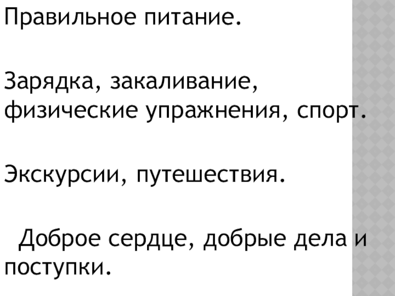 Правильное питание. Зарядка, закаливание, физические упражнения, спорт. Экскурсии, путешествия.   Доброе сердце, добрые дела и поступки.