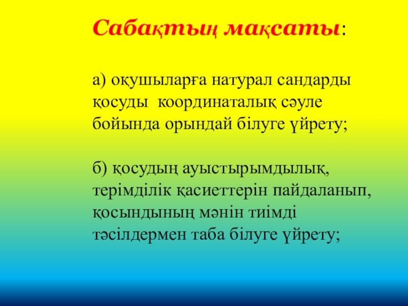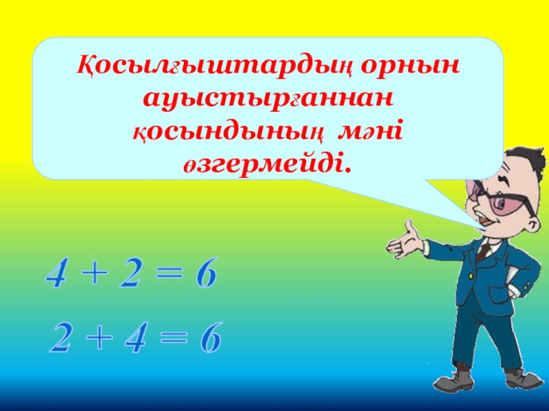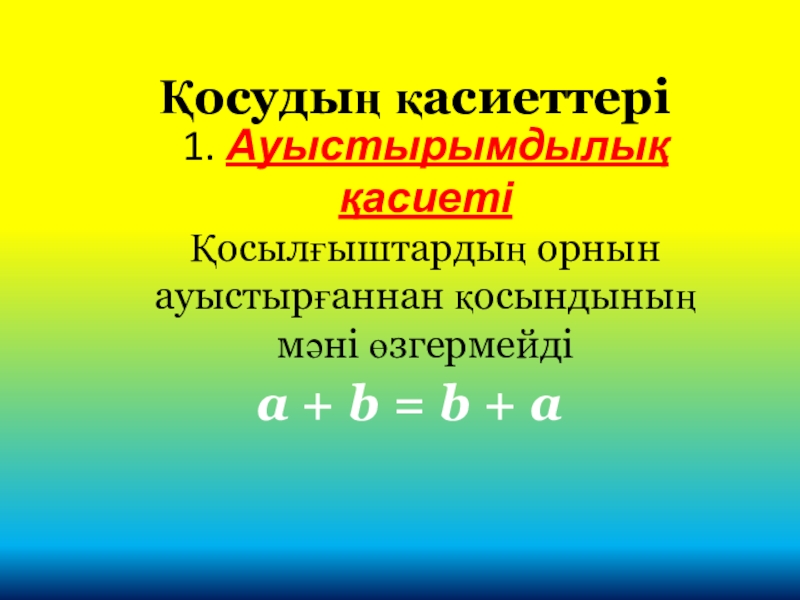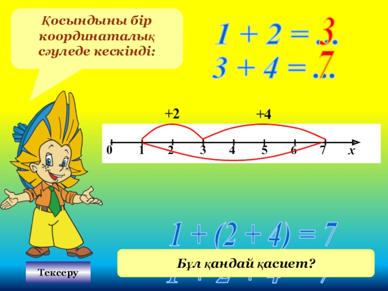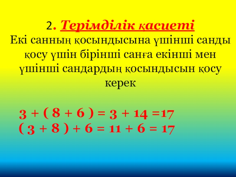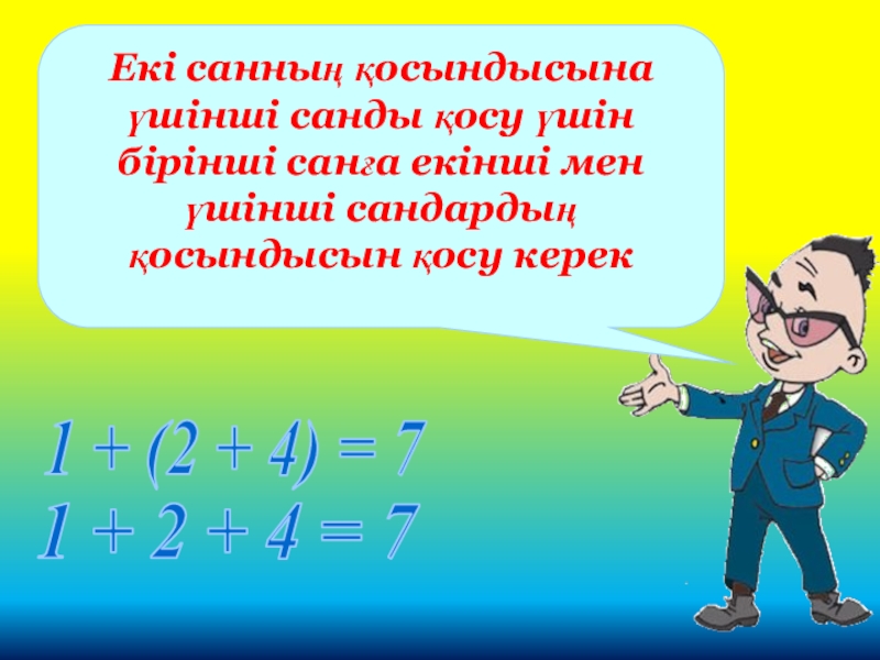 Екі санның қосындысына үшінші санды қосу үшін бірінші санға екінші мен үшінші сандардың қосындысын қосу керек