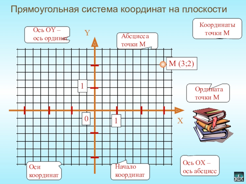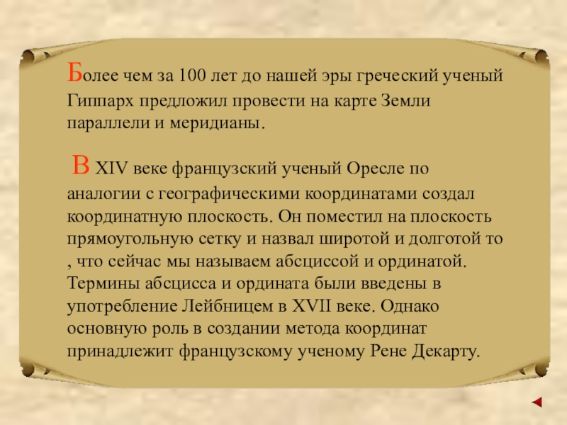В ХIV веке французский ученый Оресле по аналогии с географическими координатами создал координатную плоскость. Он поместил на плоскость прямоугольную сетку и назвал широтой и долготой то , что сейчас мы называем абсциссой и ординатой. Термины абсцисса и ордината были введены в употребление Лейбницем в XVII веке. Однако основную роль в создании метода координат принадлежит французскому ученому Рене Декарту.