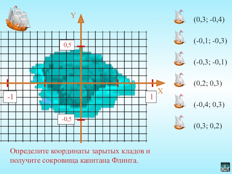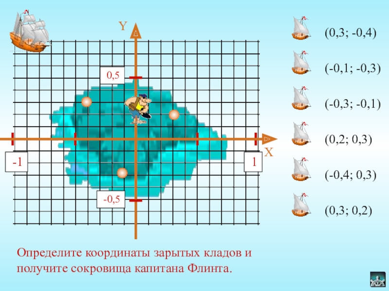 (0,3; -0,4)(-0,1; -0,3)(-0,3; -0,1)(0,2; 0,3)(-0,4; 0,3)(0,3; 0,2)Определите координаты зарытых кладов и получите сокровища капитана Флинта.