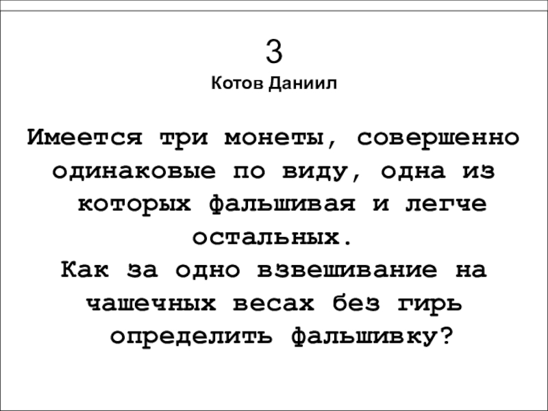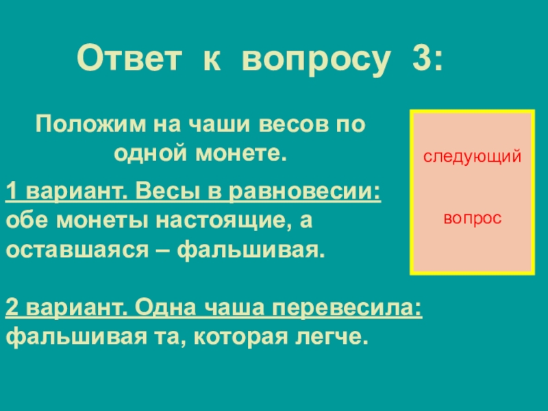 2 вариант. Одна чаша перевесила: фальшивая та, которая легче.