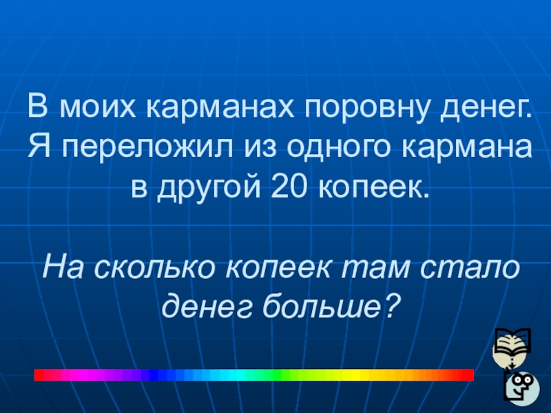 Слайд 18В моих карманах поровну денег. Я переложил из одного кармана в