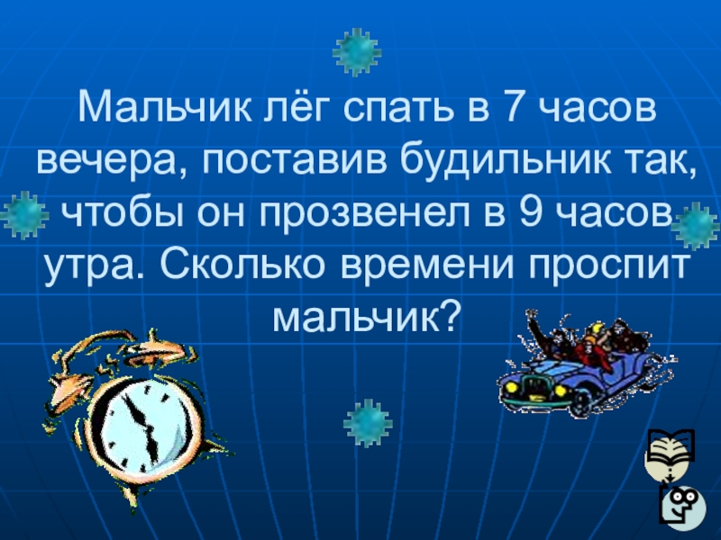 Слайд 30Мальчик лёг спать в 7 часов вечера, поставив будильник так, чтобы