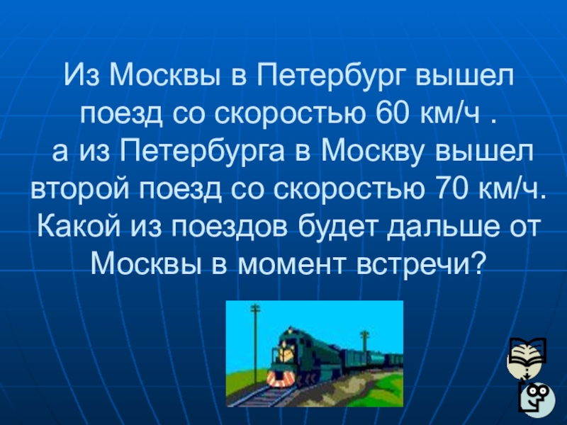 Слайд 16Из Москвы в Петербург вышел поезд со скоростью 60 км/ч .
