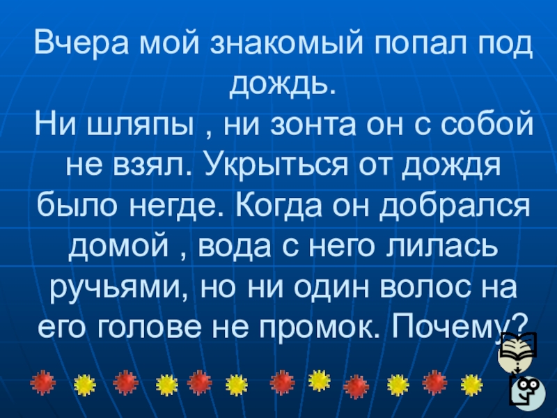 с собой не взял. Укрыться от дождя было негде. Когда он добрался домой , вода с него лилась ручьями, но ни один волос на его голове не промок. Почему?