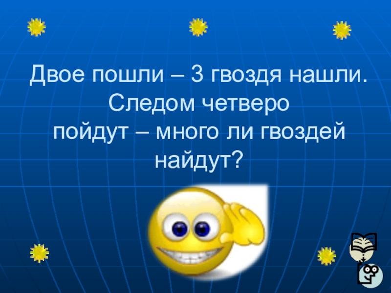 Слайд 60Двое пошли – 3 гвоздя нашли.