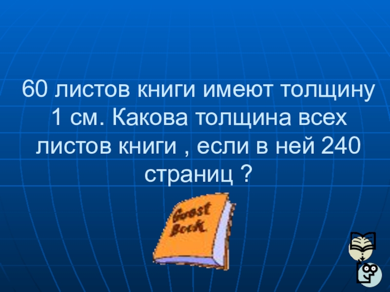 Слайд 2060 листов книги имеют толщину 1 см. Какова толщина всех листов