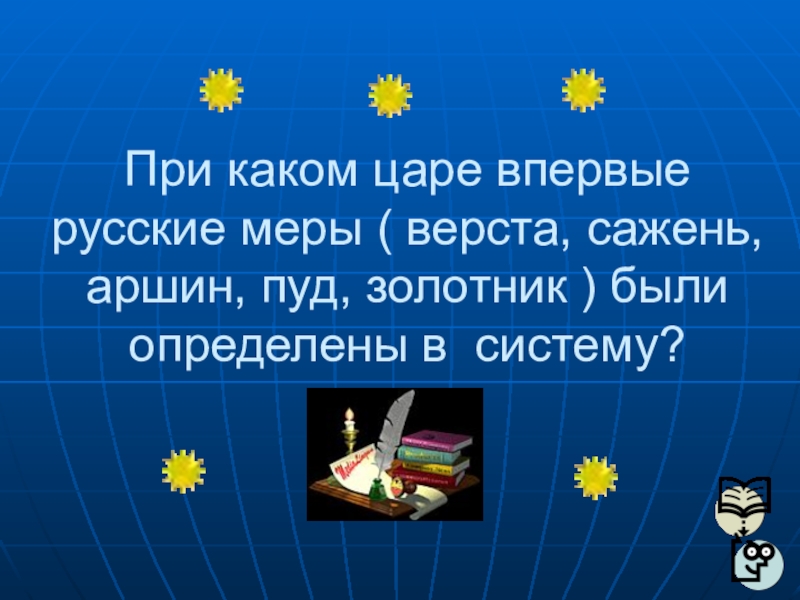 Слайд 10При каком царе впервые русские меры ( верста, сажень, аршин, пуд,