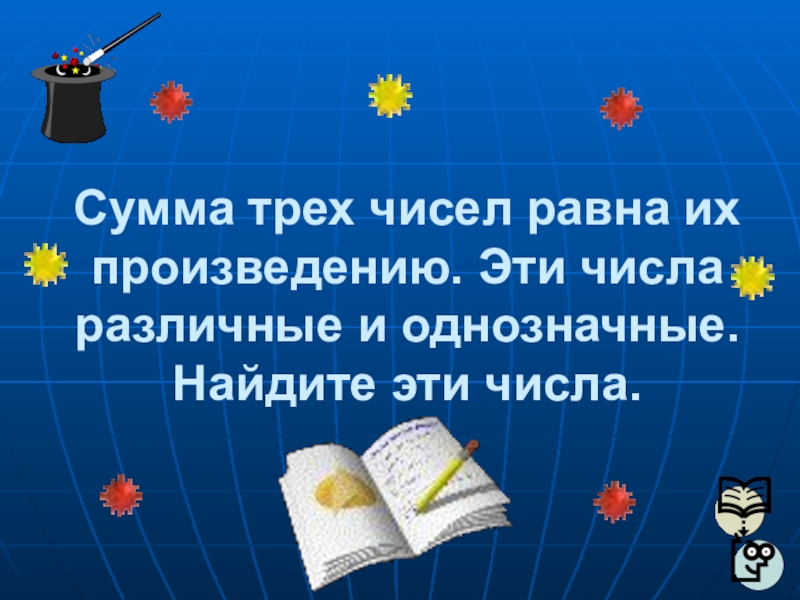 Слайд 28Сумма трех чисел равна их произведению. Эти числа различные и однозначные.