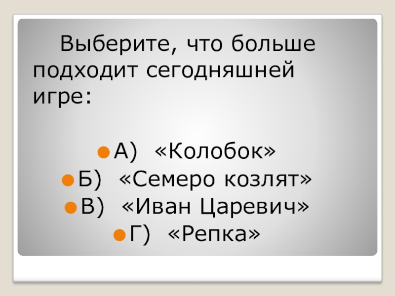 Выберите, что больше подходит сегодняшней игре:А) «Колобок»Б) «Семеро козлят»В) «Иван Царевич»Г) «Репка»