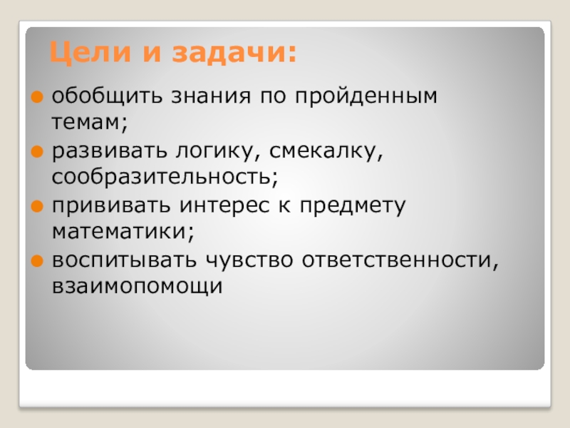 Цели и задачи:обобщить знания по пройденным темам;развивать логику, смекалку, сообразительность;прививать интерес к предмету математики;воспитывать чувство ответственности, взаимопомощи