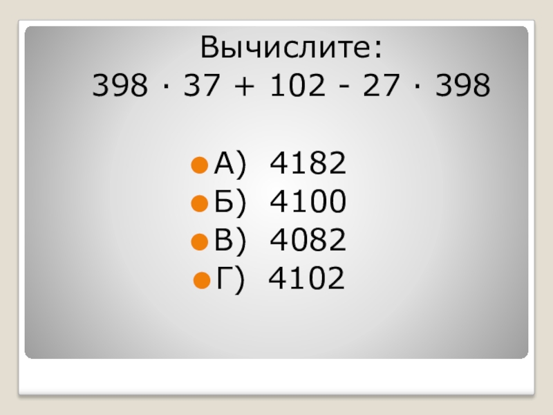 Вычислите:  398 · 37 + 102 - 27 ·