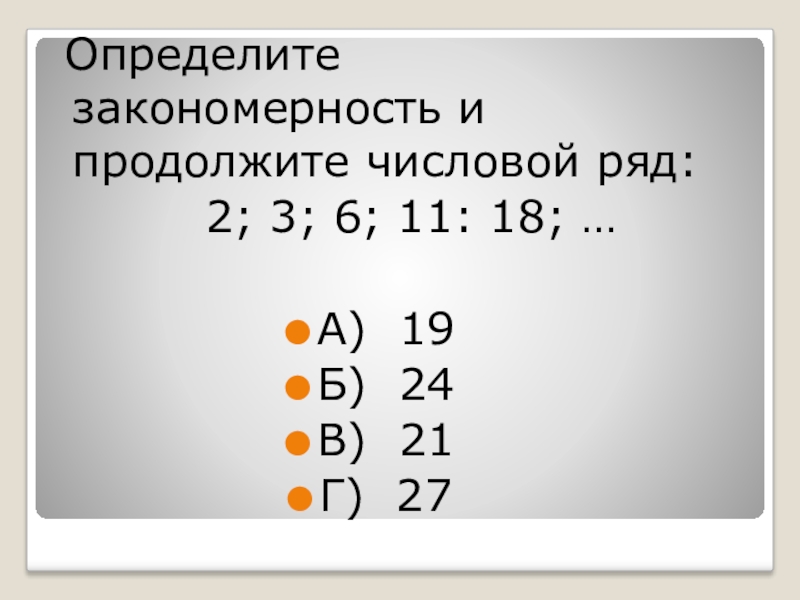 Определите закономерность и продолжите числовой ряд:     2; 3; 6; 11: 18; …А)