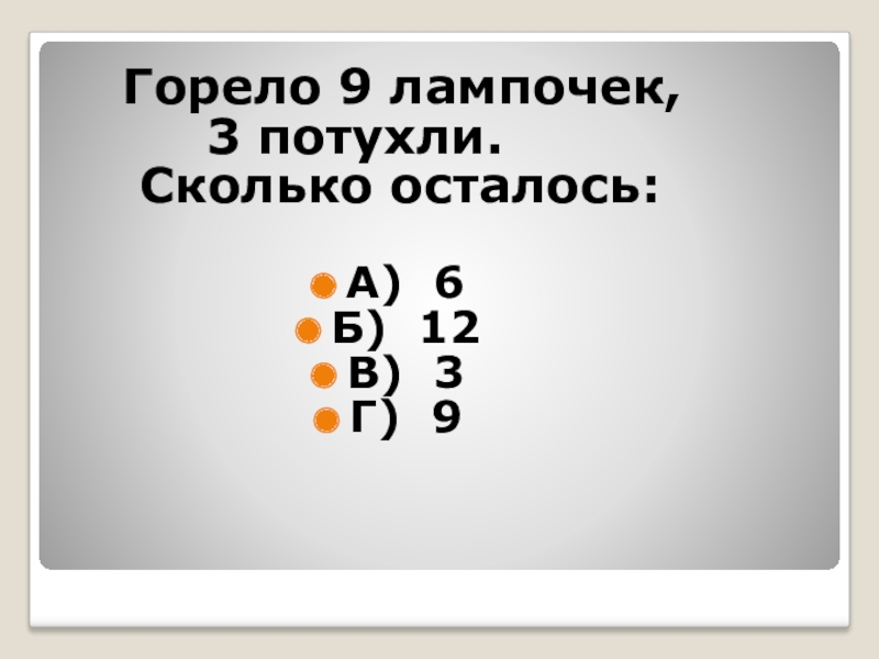 Горело 9 лампочек,      3 потухли.   Сколько осталось:А)