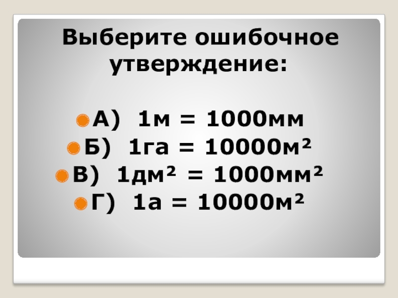 Выберите ошибочное  утверждение:А) 1м = 1000ммБ) 1га = 10000м²В) 1дм² = 1000мм²Г) 1а = 10000м²