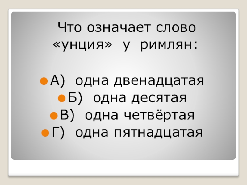 Что означает слово    «унция» у римлян:А) одна двенадцатаяБ) одна десятаяВ)