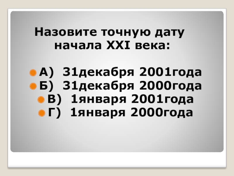 Назовите точную дату     начала XXI века:А) 31декабря 2001годаБ) 31декабря 2000года В)