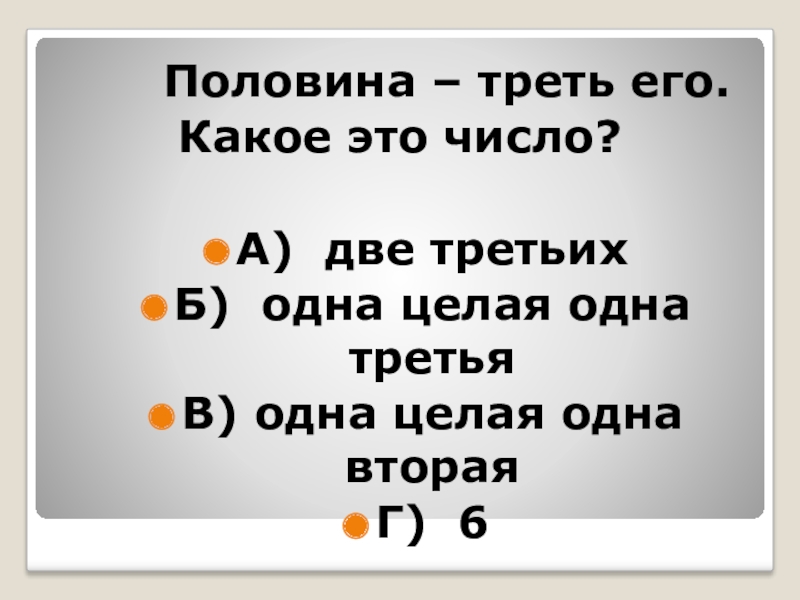 Половина – треть его.   Какое это число?А) две третьихБ) одна целая одна третьяВ)