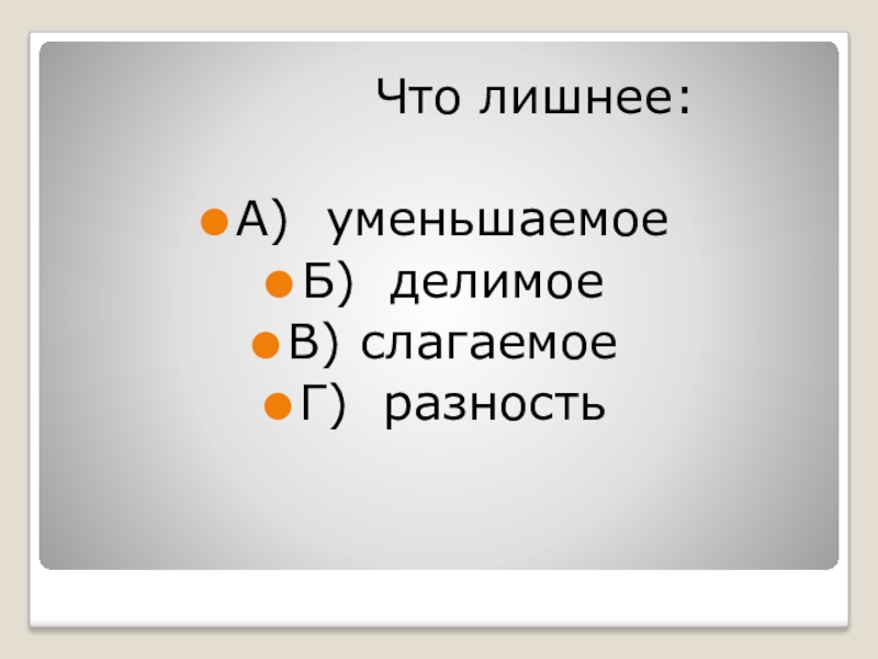 Что лишнее:А) уменьшаемоеБ) делимоеВ) слагаемоеГ) разность