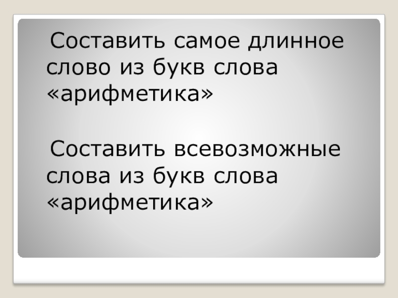 Составить самое длинное слово из букв слова «арифметика» Составить всевозможные слова из букв слова «арифметика»