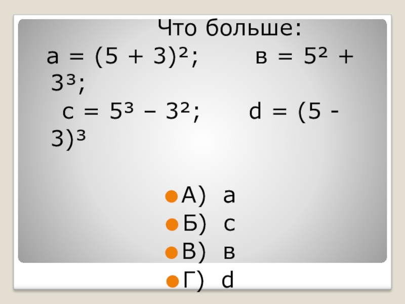 Что больше: а = (5 + 3)²;