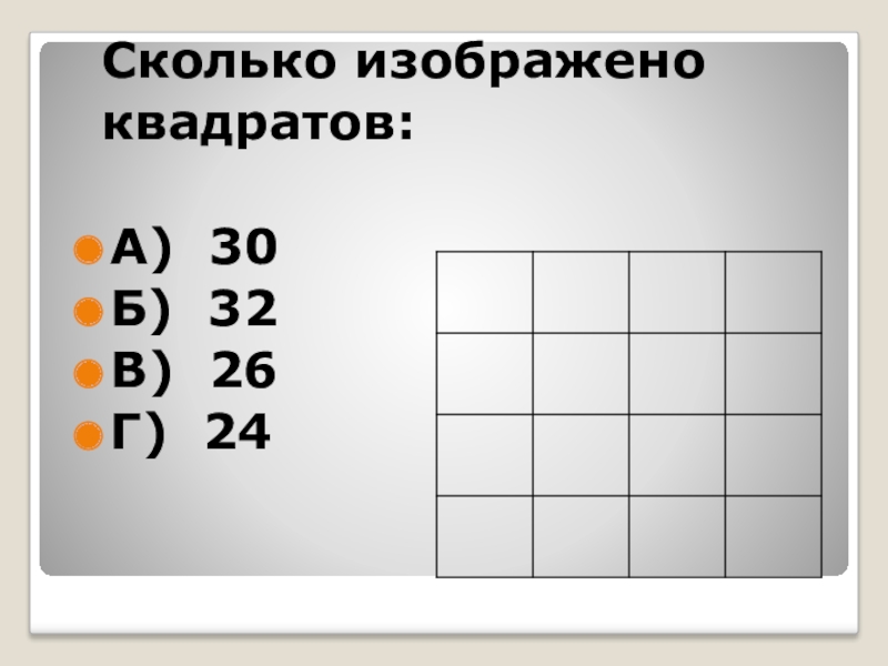 Сколько изображено квадратов:А) 30Б) 32В) 26Г) 24